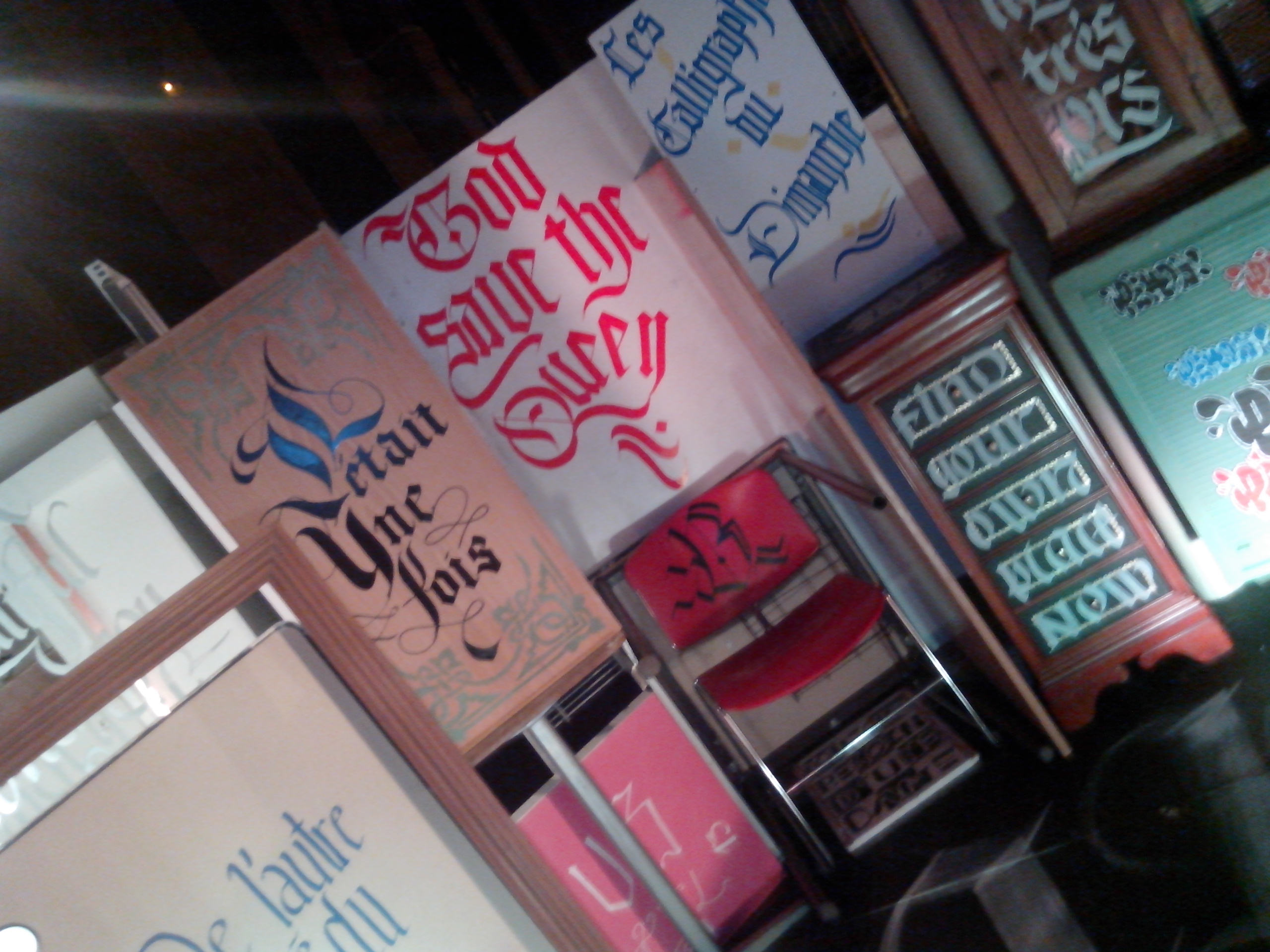 Nous avons déménagé et installé les meubles à la mairie, puis calligraphié les punch-line dessus. Samedi 4 octobre Vernissage de l’exposition puis découverte du public, et arrivée des artistes.